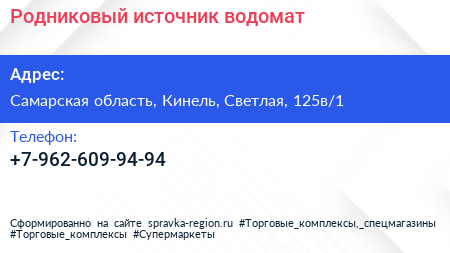 Родниковый источник, водомат по адресу Самарская область, Кинель, Светлая, 125в/1 в дальнейшем Организация, размещена в следующих категориях: