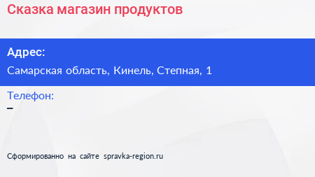 Сказка, магазин продуктов по адресу Самарская область, Кинель, Степная, 1 в дальнейшем Организация, размещена в следующих категориях: