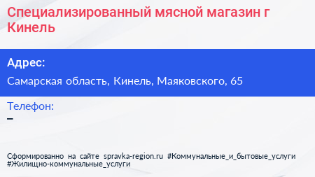 Специализированный мясной магазин, г. Кинель по адресу Самарская область, Кинель, Маяковского, 65 в дальнейшем Организация, размещена в следующих категориях: