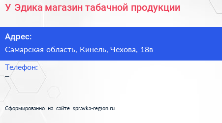 У Эдика, магазин табачной продукции по адресу Самарская область, Кинель, Чехова, 18в в дальнейшем Организация, размещена в следующих категориях:
