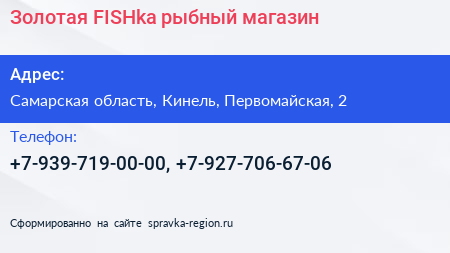 Золотая FISHka, рыбный магазин по адресу Самарская область, Кинель, Первомайская, 2 в дальнейшем Организация, размещена в следующих категориях: