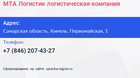 МТА-Логистик, логистическая компания по адресу Самарская область, Кинель, Первомайская, 1 в дальнейшем Организация, размещена в следующих категориях: