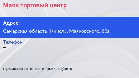 Маяк, торговый центр по адресу Самарская область, Кинель, Маяковского, 83а в дальнейшем Организация, размещена в следующих категориях: