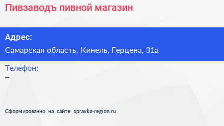 Пивзаводъ, пивной магазин по адресу Самарская область, Кинель, Герцена, 31а в дальнейшем Организация, размещена в следующих категориях: