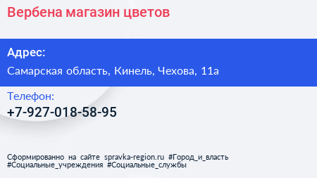 Вербена, магазин цветов по адресу Самарская область, Кинель, Чехова, 11а в дальнейшем Организация, размещена в следующих категориях: