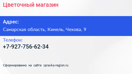Цветочный магазин по адресу Самарская область, Кинель, Чехова, 9 в дальнейшем Организация, размещена в следующих категориях:
