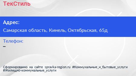 ТекСтиль по адресу Самарская область, Кинель, Октябрьская, 65д в дальнейшем Организация, размещена в следующих категориях: