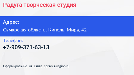Радуга, творческая студия по адресу Самарская область, Кинель, Мира, 42 в дальнейшем Организация, размещена в следующих категориях: