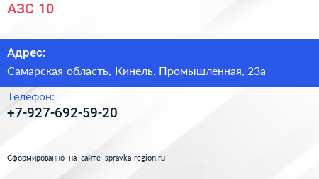 АЗС №10 по адресу Самарская область, Кинель, Промышленная, 23а в дальнейшем Организация, размещена в следующих категориях: