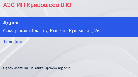 АЗС, ИП Кривошеев В.Ю. по адресу Самарская область, Кинель, Крымская, 2и в дальнейшем Организация, размещена в следующих категориях: