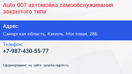Auto 007, автомойка самообслуживания закрытого типа по адресу Самарская область, Кинель, Мостовая, 28Б в дальнейшем Организация, размещена в следующих категориях: