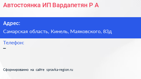 Автостоянка, ИП Вардапетян Р.А. по адресу Самарская область, Кинель, Маяковского, 83д в дальнейшем Организация, размещена в следующих категориях: