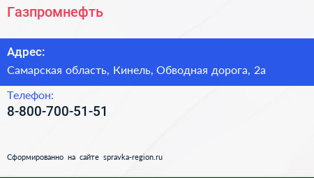 Газпромнефть по адресу Самарская область, Кинель, Обводная дорога, 2а в дальнейшем Организация, размещена в следующих категориях: