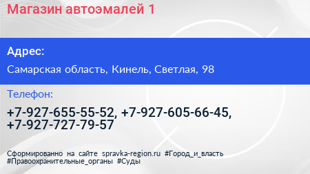 Магазин автоэмалей №1 по адресу Самарская область, Кинель, Светлая, 98 в дальнейшем Организация, размещена в следующих категориях: