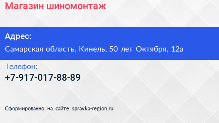 Магазин-шиномонтаж по адресу Самарская область, Кинель, 50 лет Октября, 12а в дальнейшем Организация, размещена в следующих категориях: