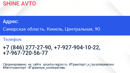 SHINE AVTO по адресу Самарская область, Кинель, Центральная, 90 в дальнейшем Организация, размещена в следующих категориях: