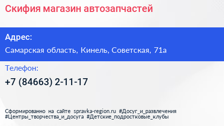 Скифия, магазин автозапчастей по адресу Самарская область, Кинель, Советская, 71а в дальнейшем Организация, размещена в следующих категориях: