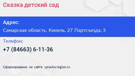 Сказка, детский сад по адресу Самарская область, Кинель, 27 Партсъезда, 3 в дальнейшем Организация, размещена в следующих категориях: