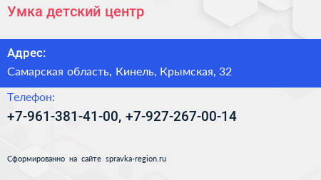 Умка, детский центр по адресу Самарская область, Кинель, Крымская, 32 в дальнейшем Организация, размещена в следующих категориях: