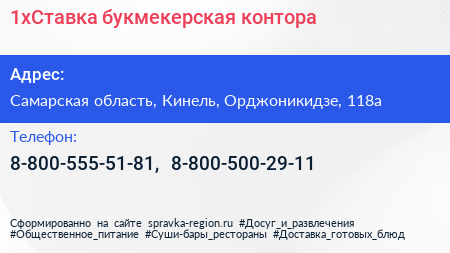 1xСтавка, букмекерская контора по адресу Самарская область, Кинель, Орджоникидзе, 118а в дальнейшем Организация, размещена в следующих категориях: