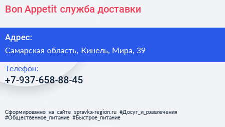 Bon Аppetit, служба доставки по адресу Самарская область, Кинель, Мира, 39 в дальнейшем Организация, размещена в следующих категориях: