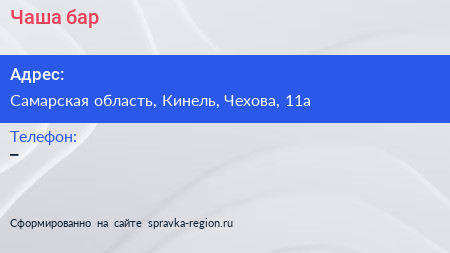 Чаша, бар по адресу Самарская область, Кинель, Чехова, 11а в дальнейшем Организация, размещена в следующих категориях:
