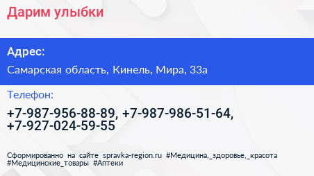 Дарим улыбки по адресу Самарская область, Кинель, Мира, 33а в дальнейшем Организация, размещена в следующих категориях: