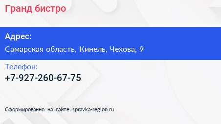 Гранд, бистро по адресу Самарская область, Кинель, Чехова, 9 в дальнейшем Организация, размещена в следующих категориях: