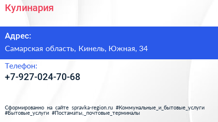 Кулинария по адресу Самарская область, Кинель, Южная, 34 в дальнейшем Организация, размещена в следующих категориях: