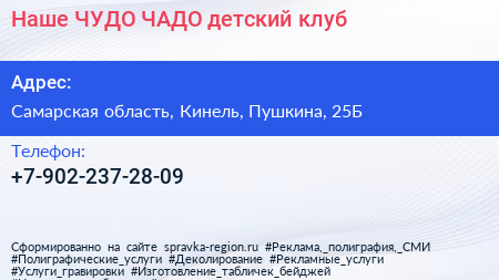 Наше ЧУДО-ЧАДО, детский клуб по адресу Самарская область, Кинель, Пушкина, 25Б в дальнейшем Организация, размещена в следующих категориях: