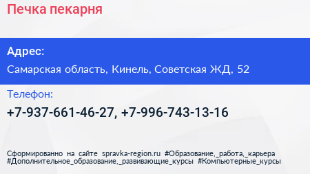 Печка, пекарня по адресу Самарская область, Кинель, Советская ЖД, 52 в дальнейшем Организация, размещена в следующих категориях: