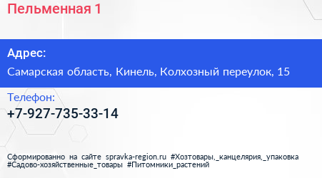 Пельменная №1 по адресу Самарская область, Кинель, Колхозный переулок, 15 в дальнейшем Организация, размещена в следующих категориях: