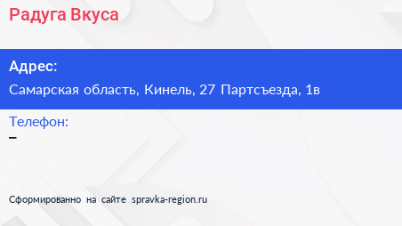 Радуга Вкуса по адресу Самарская область, Кинель, 27 Партсъезда, 1в в дальнейшем Организация, размещена в следующих категориях: