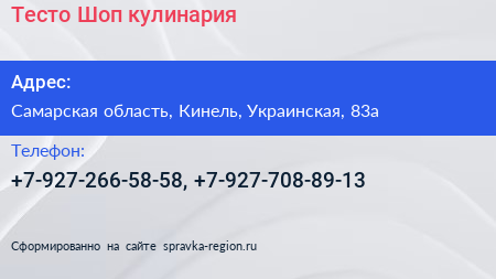 Тесто-Шоп, кулинария по адресу Самарская область, Кинель, Украинская, 83а в дальнейшем Организация, размещена в следующих категориях: