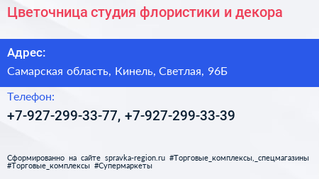 Цветочница, студия флористики и декора по адресу Самарская область, Кинель, Светлая, 96Б в дальнейшем Организация, размещена в следующих категориях:
