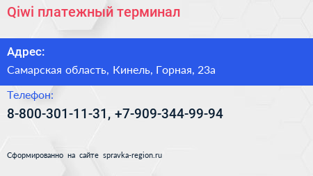 Qiwi, платежный терминал по адресу Самарская область, Кинель, Горная, 23а в дальнейшем Организация, размещена в следующих категориях: