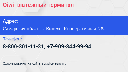 Qiwi, платежный терминал по адресу Самарская область, Кинель, Кооперативная, 28а в дальнейшем Организация, размещена в следующих категориях: