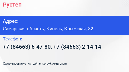 Рустеп по адресу Самарская область, Кинель, Крымская, 32 в дальнейшем Организация, размещена в следующих категориях: