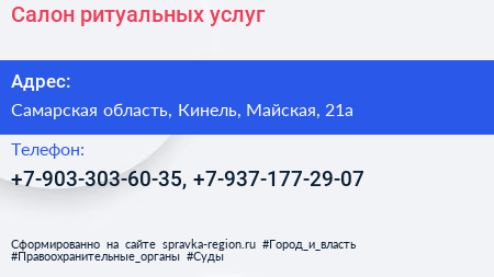Салон ритуальных услуг по адресу Самарская область, Кинель, Майская, 21а в дальнейшем Организация, размещена в следующих категориях:
