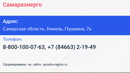 Самараэнерго по адресу Самарская область, Кинель, Пушкина, 7а в дальнейшем Организация, размещена в следующих категориях: