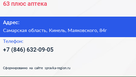 63 плюс, аптека по адресу Самарская область, Кинель, Маяковского, 84г в дальнейшем Организация, размещена в следующих категориях: