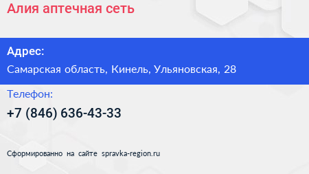 Алия, аптечная сеть по адресу Самарская область, Кинель, Ульяновская, 28 в дальнейшем Организация, размещена в следующих категориях: