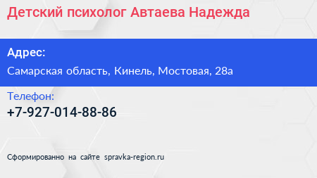 Детский психолог Автаева Надежда по адресу Самарская область, Кинель, Мостовая, 28а в дальнейшем Организация, размещена в следующих категориях: