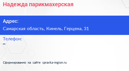 Надежда, парикмахерская по адресу Самарская область, Кинель, Герцена, 31 в дальнейшем Организация, размещена в следующих категориях: