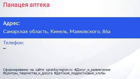 Панацея, аптека по адресу Самарская область, Кинель, Маяковского, 86а в дальнейшем Организация, размещена в следующих категориях: