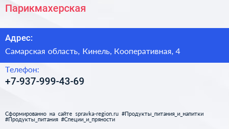 Парикмахерская по адресу Самарская область, Кинель, Кооперативная, 4 в дальнейшем Организация, размещена в следующих категориях: