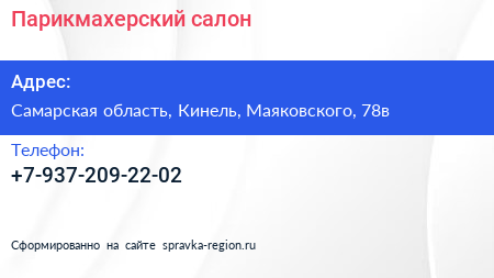 Парикмахерский салон по адресу Самарская область, Кинель, Маяковского, 78в в дальнейшем Организация, размещена в следующих категориях: