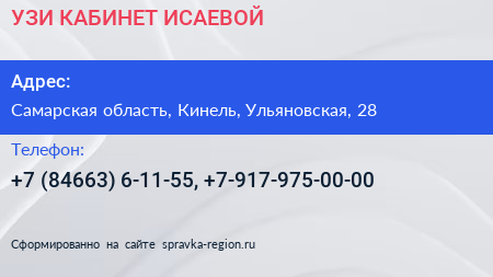 УЗИ КАБИНЕТ ИСАЕВОЙ по адресу Самарская область, Кинель, Ульяновская, 28 в дальнейшем Организация, размещена в следующих категориях: