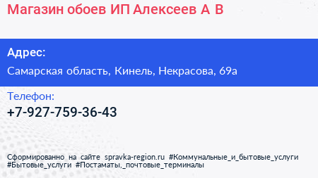 Магазин обоев, ИП Алексеев А.В. по адресу Самарская область, Кинель, Некрасова, 69а в дальнейшем Организация, размещена в следующих категориях: