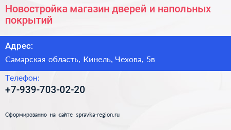 Новостройка, магазин дверей и напольных покрытий по адресу Самарская область, Кинель, Чехова, 5в в дальнейшем Организация, размещена в следующих категориях: